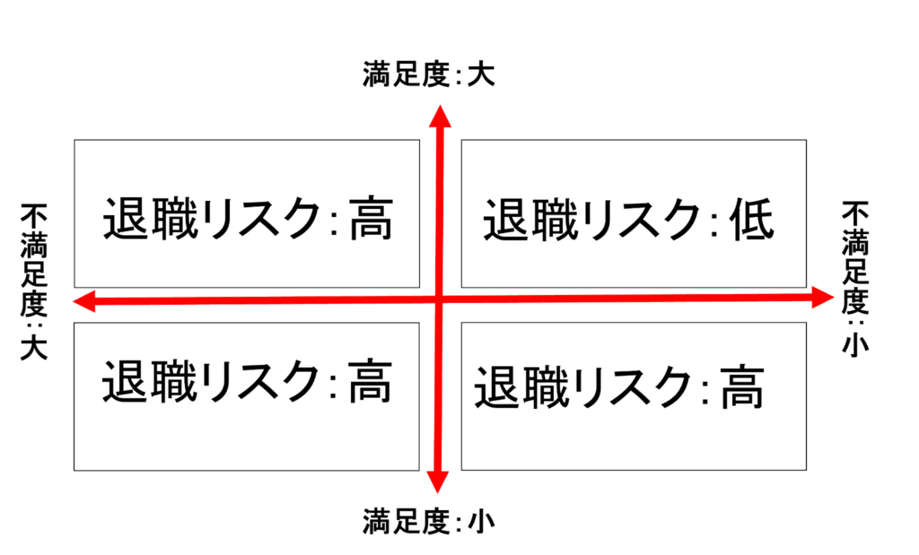 ここでのポイントは、不満足度が大きければ退職リスクが高いということ、そして、不満足度が小さくても、満足度も小さければやはり退職リスクは高いということです。